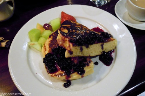 I went for one of their specials – pancakes with blueberry jam syrup. They were super thick (almost an inch) and had a very cakey texture to them. I ended up using some of the maple syrup from my husband’s plate to add a tiny bit more sweetness to it, but the blueberry flavor was nice. I would’ve probably liked them more if they were less cakey and more fluffy because they were a little too dense and filling, but it all washed down easily with their delicious coffee (even the decaf was good).