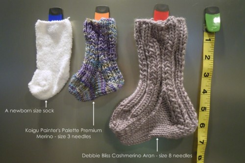 So I decided to grab some scrap Koigu yarn I had from making my first pair of socks (yikes! 2 years ago!) and tried making the sock again. This time, the result was much better (as you can see by the middle sock in the photo above) and closer to what a real newborn size sock should be.