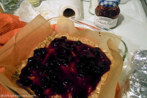 – Spread the blueberry preserves on top. I didn’t provide an exact measurement because you can put as much or as little as you want to. I used about 1/2 a jar in mine.