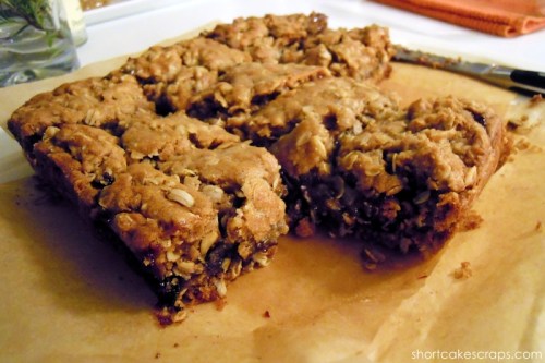 I’ve been watching a lot of the Food Network shows lately — I think Ina and Giada are my new best friends. I saw Giada make some apricot oat bars one morning and decided to try making a batch using things I had on hand, so here’s my rendition with blueberry jam instead of apricots. It’s a really simple recipe and I think it would work well with any fruit jam you have in stock. The key thing is to use old fashioned oats and not the instant stuff; she mentioned on the TV show that the instant stuff won’t hold it’s shape once it’s baked.
