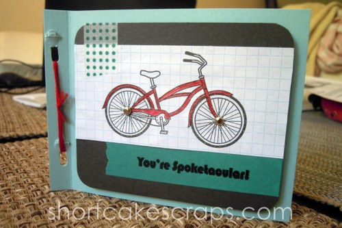 – cardstock base in “pool” by Paper Source, cut from 8.5″ x 11″ sheet to two 4″ x 5.25″ rectangles, then joined together along the left edge with a staple-less stapler and red embroidery floss