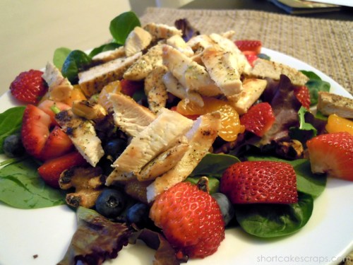 I used a bag of arugula salad blend from Stop ‘n Shop which included some baby spinach leaves. I cooked 4 thin-sliced chicken breasts in a non-stick pan with a little bit of olive oil and seasoned them with some Penzey’s Fox Point seasoning (I am addicted to this stuff by the way … I use it on just about everything because it’s so good!). Since they’re so thin it only takes a couple of minutes to cook on each side. My husband’s salad had a few cut up strawberries, a handful of blueberries, toasted walnuts, and some mandarin orange slices (I just used some that come in the individual snack sized containers).