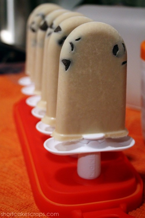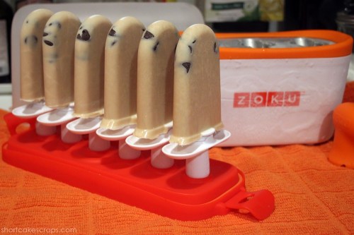 I decided to try a recipe I saw on Pinterest of “Invisible Cookie Dough Ice Pops” which was adapted from a recipe from “The Cookie Dough Lover’s Cookbook“. The recipe said it would make 10 ice pops at 2.5 ounces each so I cut it in half and managed to make exactly 6 with the Zoku device.