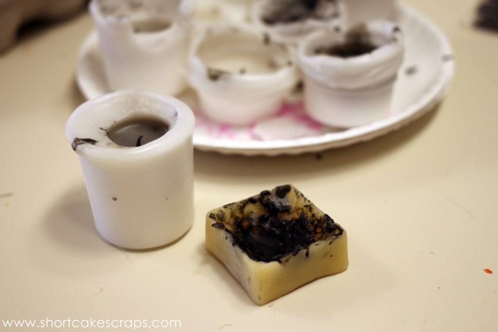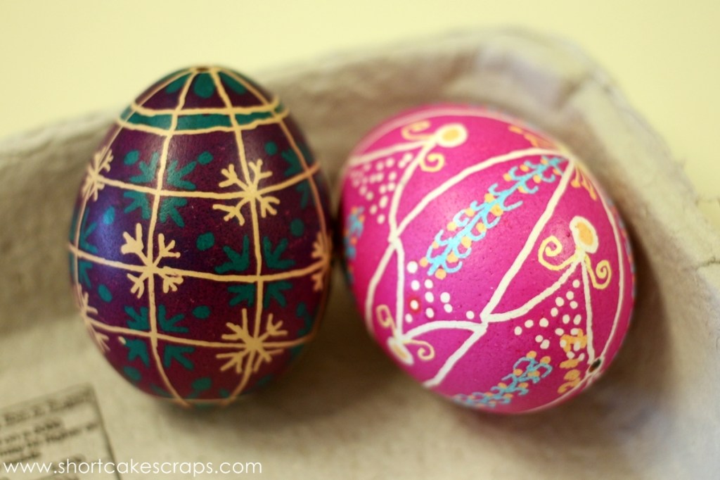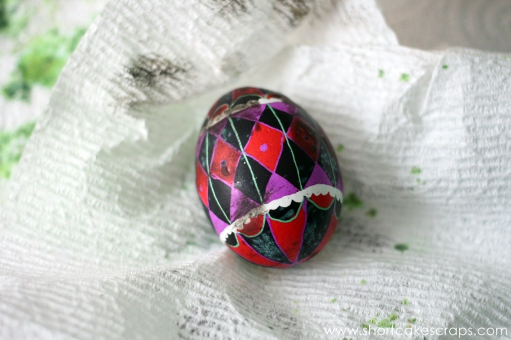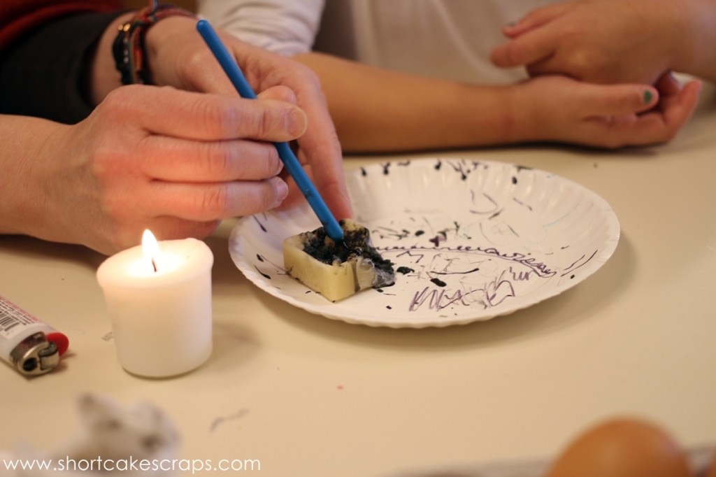 Basically the removal process is done by melting the wax and rubbing it away. It took a few minutes until it was all finally off and then voila! Our decorated eggs!