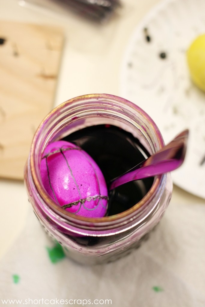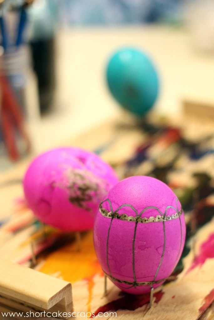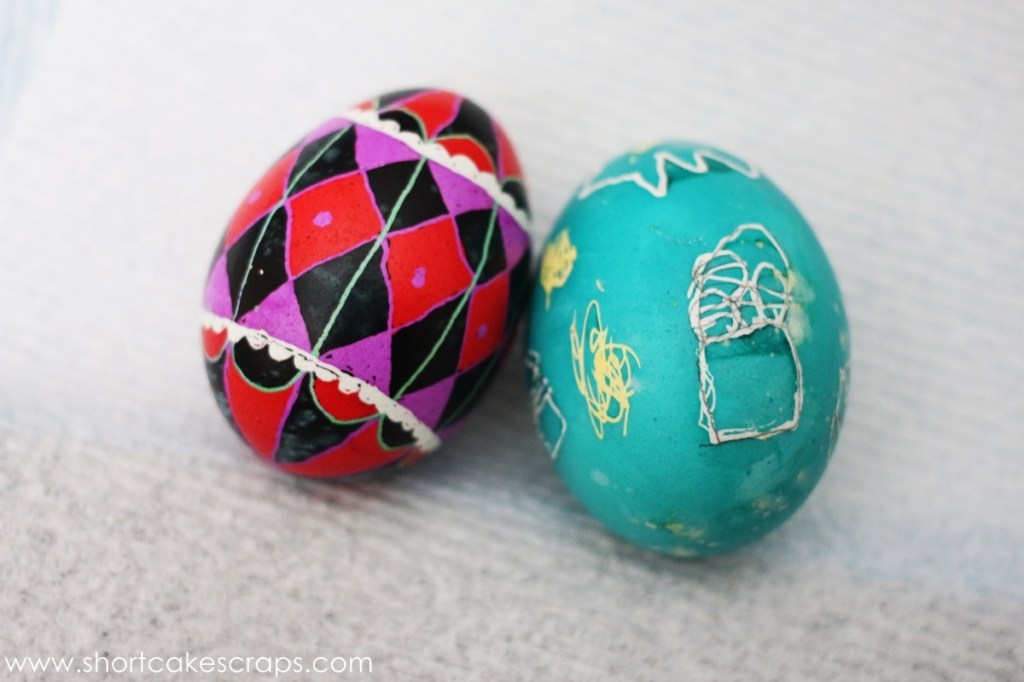 Again as mentioned earlier, I wanted mine to be a lot more green but now that I understand the order of applying the wax and dyeing the egg I can plan better next time. E drew an Easter basket, some eggs, and hearts on hers.