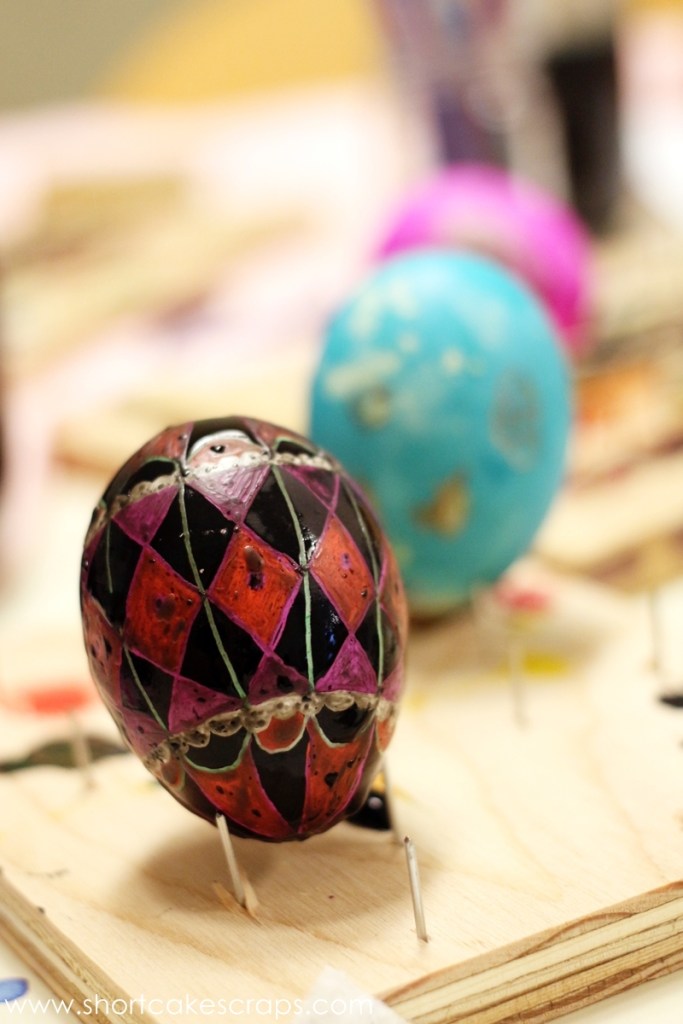 (Aren’t those drying “racks” made with wood and nails brilliant?) And then the hardest part was waiting for it to dry enough before the final reveal. Anne showed me how to remove the wax so we could do it at home a couple of hours later. We carefully transported the eggs home and then the time finally came when I could see how it all came together.