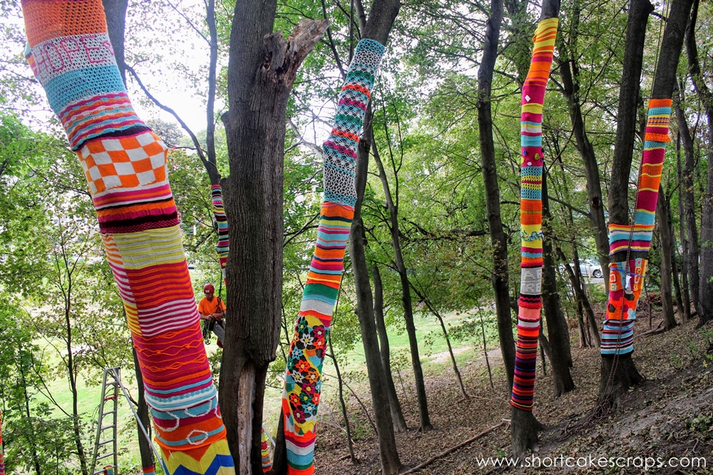 There was a lot of planning that went into the project, and a really wonderful feeling of community whenever the contributing artists gathered during the summer. People shared ideas, praised each other’s work, and encouraged one another along the way. We got together one day to lay out the finished pieces along a hill to see how they would be pieced together on the trees, and it was awesome to see it all come together.