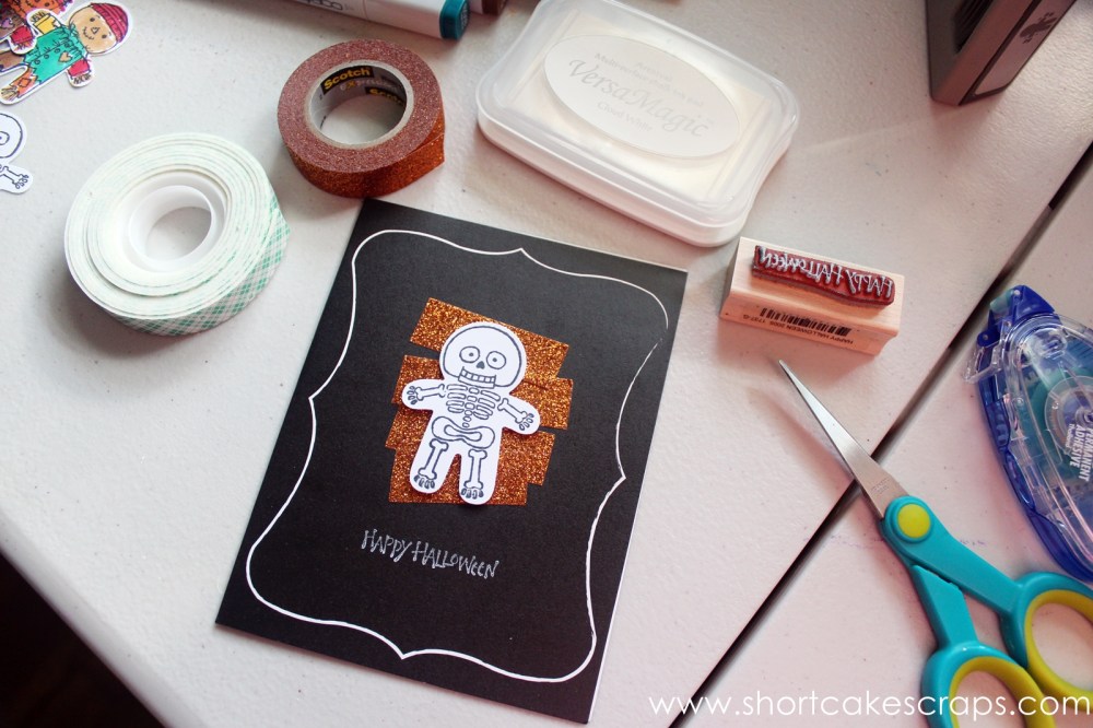 I used a pre-made card base, added some strips of glittery washi tape, and adhered one of the punched out skeleton images on top. I stamped a “happy halloween” sentiment using a white ink pad. And voila! A simple Halloween card that’ll probably end up going to one of her classmates. 🙂