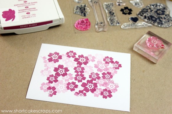 One way you can stretch the use of an ink pad is to stamp an image more than once without reinking it. In this example I stamped the flower images a couple of times before going back to the ink pad so that the images would be lighter each time they were stamped. It makes it look like I used 3 or 4 ink pads, and it makes layering images easy to do.