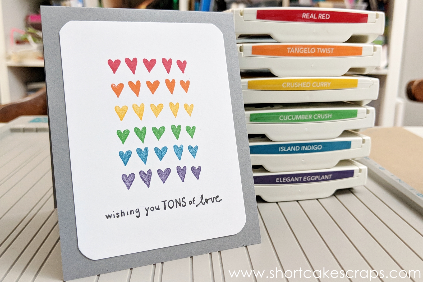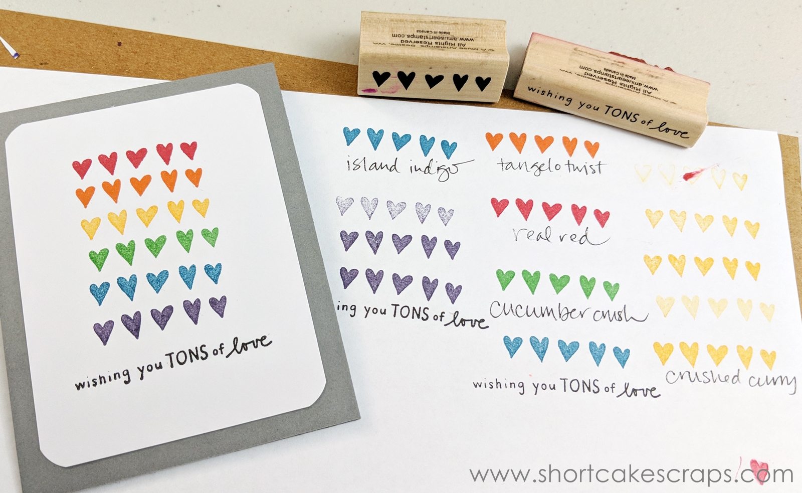 Both of these stamps (the row of hearts and the sentiment) are older stamps that I’ve had for years by A Muse Art Stamps. The ink pads used are all by Stampin’ Up!.