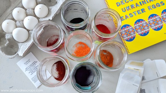 So if you’re looking for a new craft to try around the Easter holiday, definitely give Pysanky eggs a try. And if you get to the point where you want to make seriously good, straight lines (unlike mine!) there are tools you can buy such as an electric kistka and different sized kistka tips. I am already thinking about what I want to try next year (definitely the single colored concept) such as stencils and different shades of dye. For now, these jars will go back down to the basement until we work with them again (which is one nice thing – they can be stored away and reused).