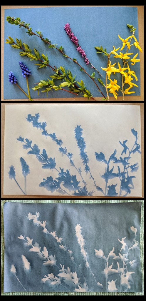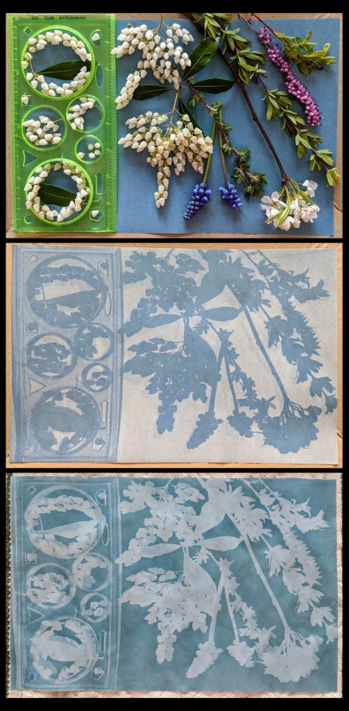 Have you tried working with photosensitive sunprint paper? We had one very sunny day this week and collected some pretty flowers during our walk. I showed our daughter how to use the special paper and now we’re trying to come up with more abstract items to use next time.