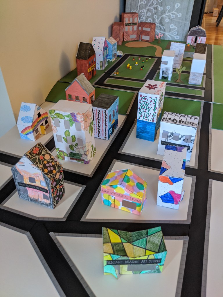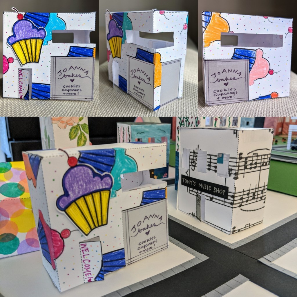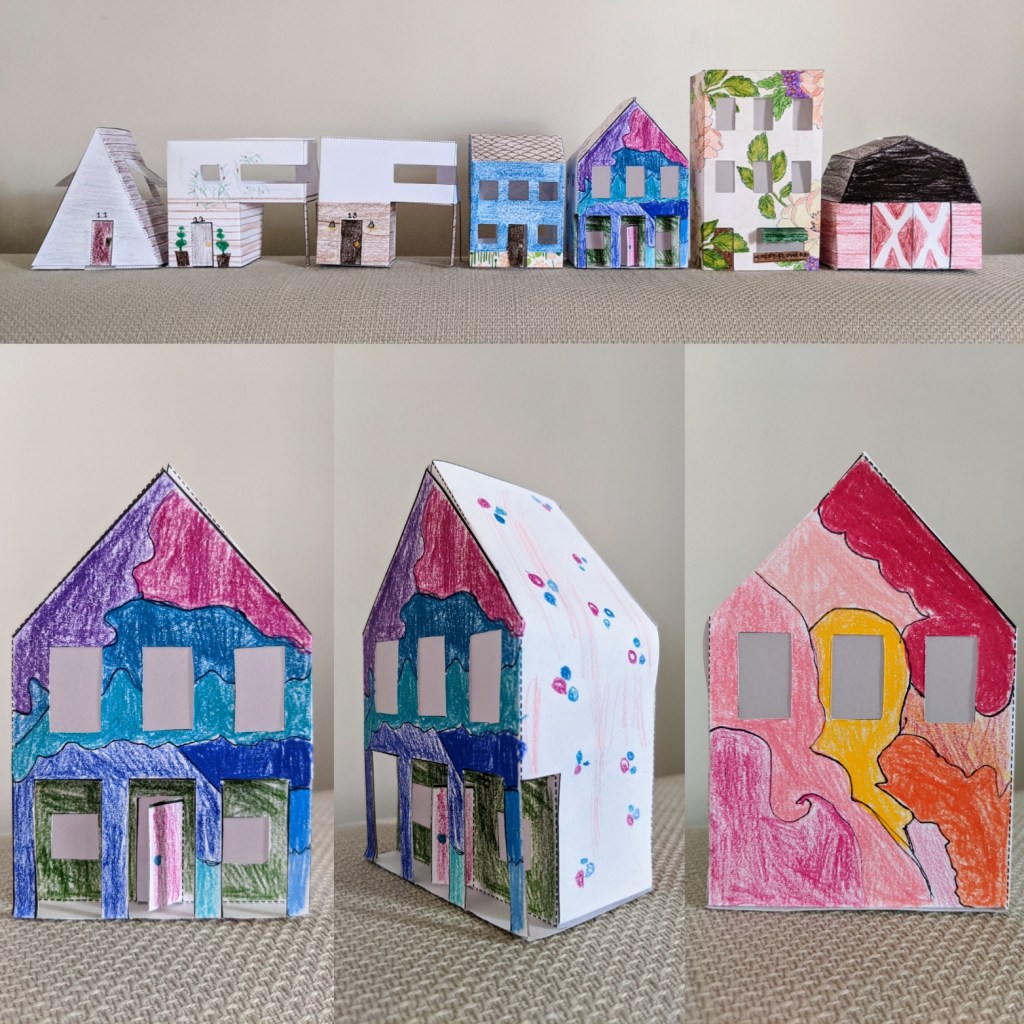 As you can see, you can really stretch your imagination when it comes to decorating the buildings. We used colored pencils, markers, dot paint, gel pens, patterned paper, and washi tape. Basically, many things you probably already have on hand right now. (Come to think of it, I’m a little surprised that our daughter hasn’t brought out the glitter yet …)