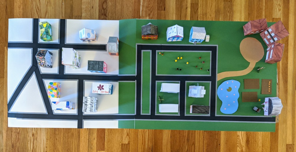 We used two pieces of white poster board paper and set them on top of large cardboard boxes. The roads are 1″ wide strips of black cardstock. The sidewalks are 1/4″ wide strips of grey cardstock.