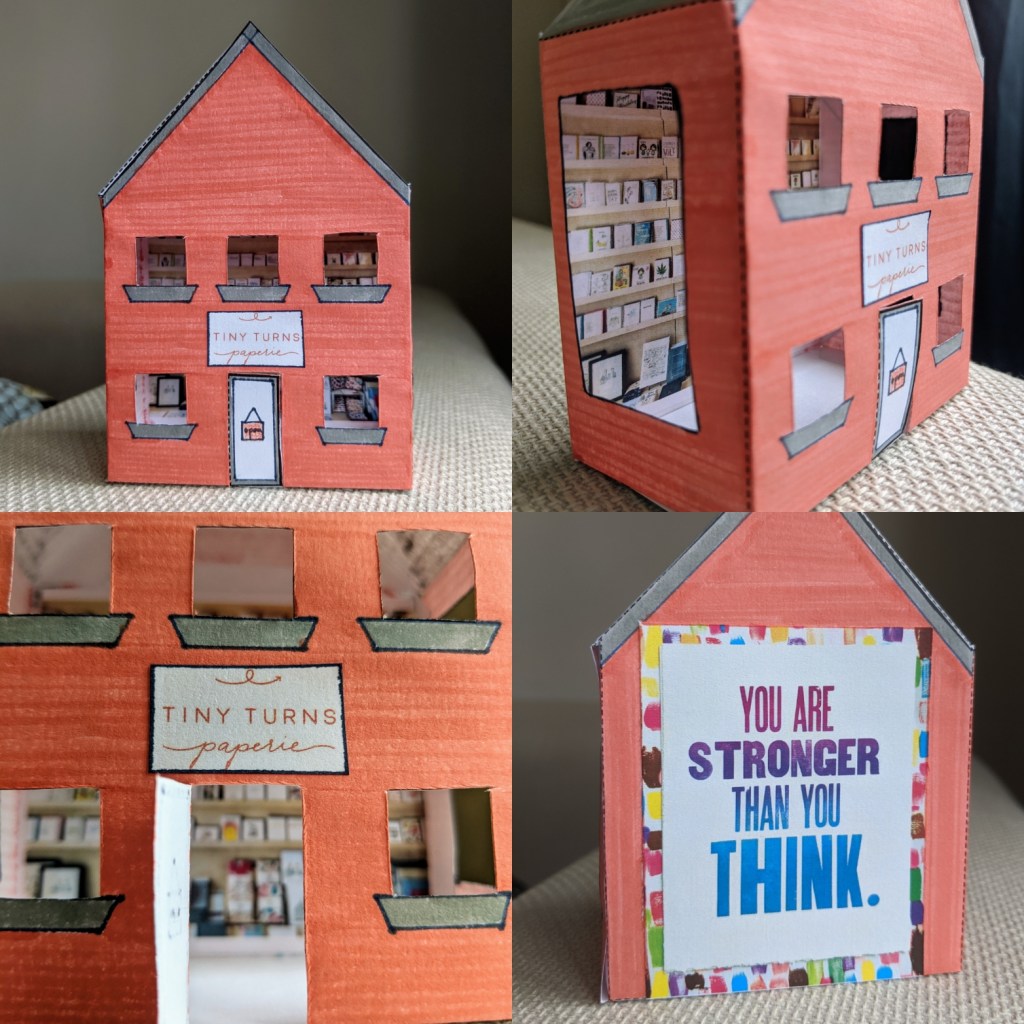 A lot of the buildings we’ve made are of imaginative businesses. I made a dream version of my friend Jen’s stationery store, Tiny Turns Paperie, into a high-ceilinged building with a gigantic card wall inside. I printed out a very small version of our friend Marie’s letterpress work and applied it on the back of the building as if it was a mural.